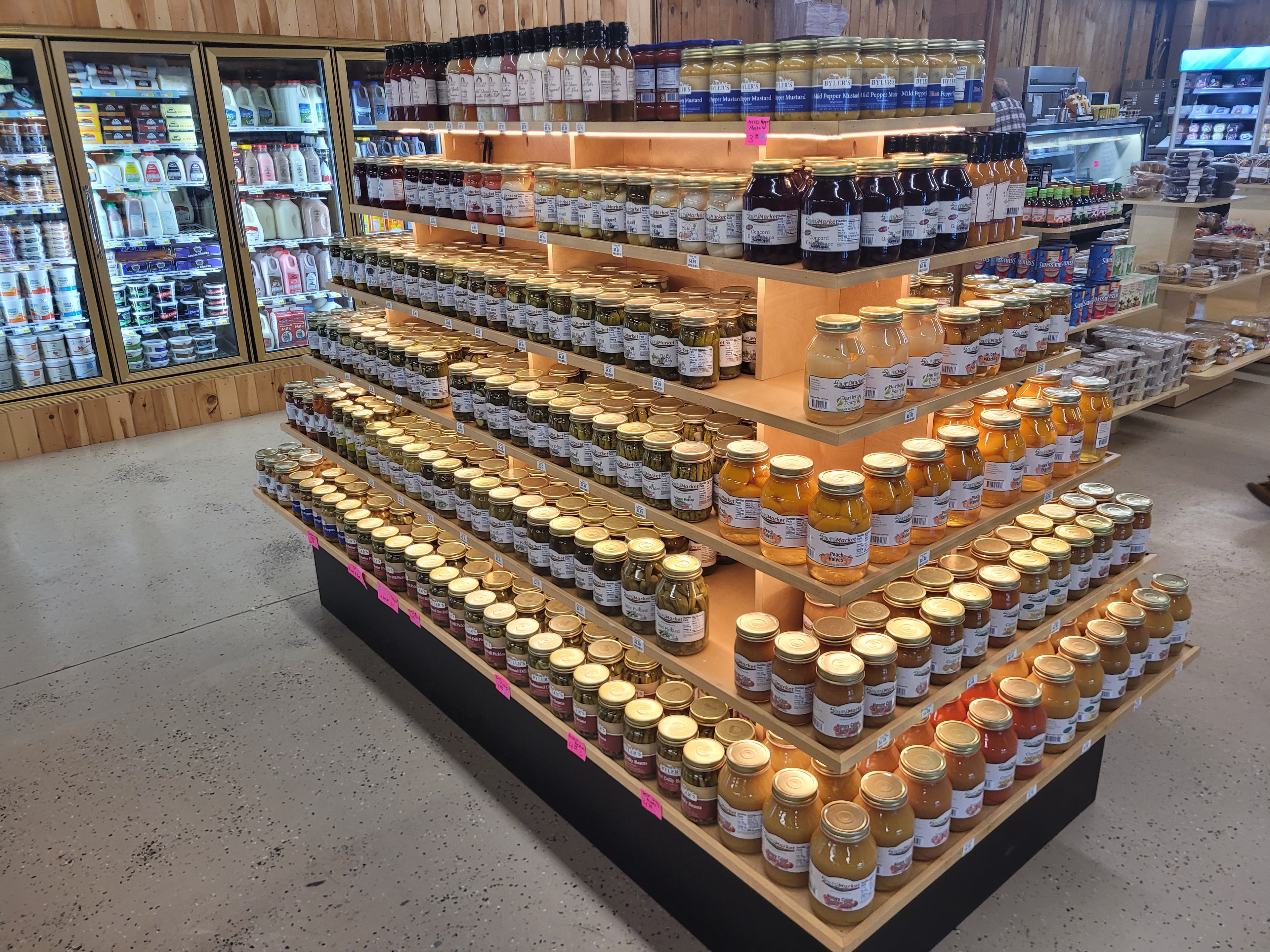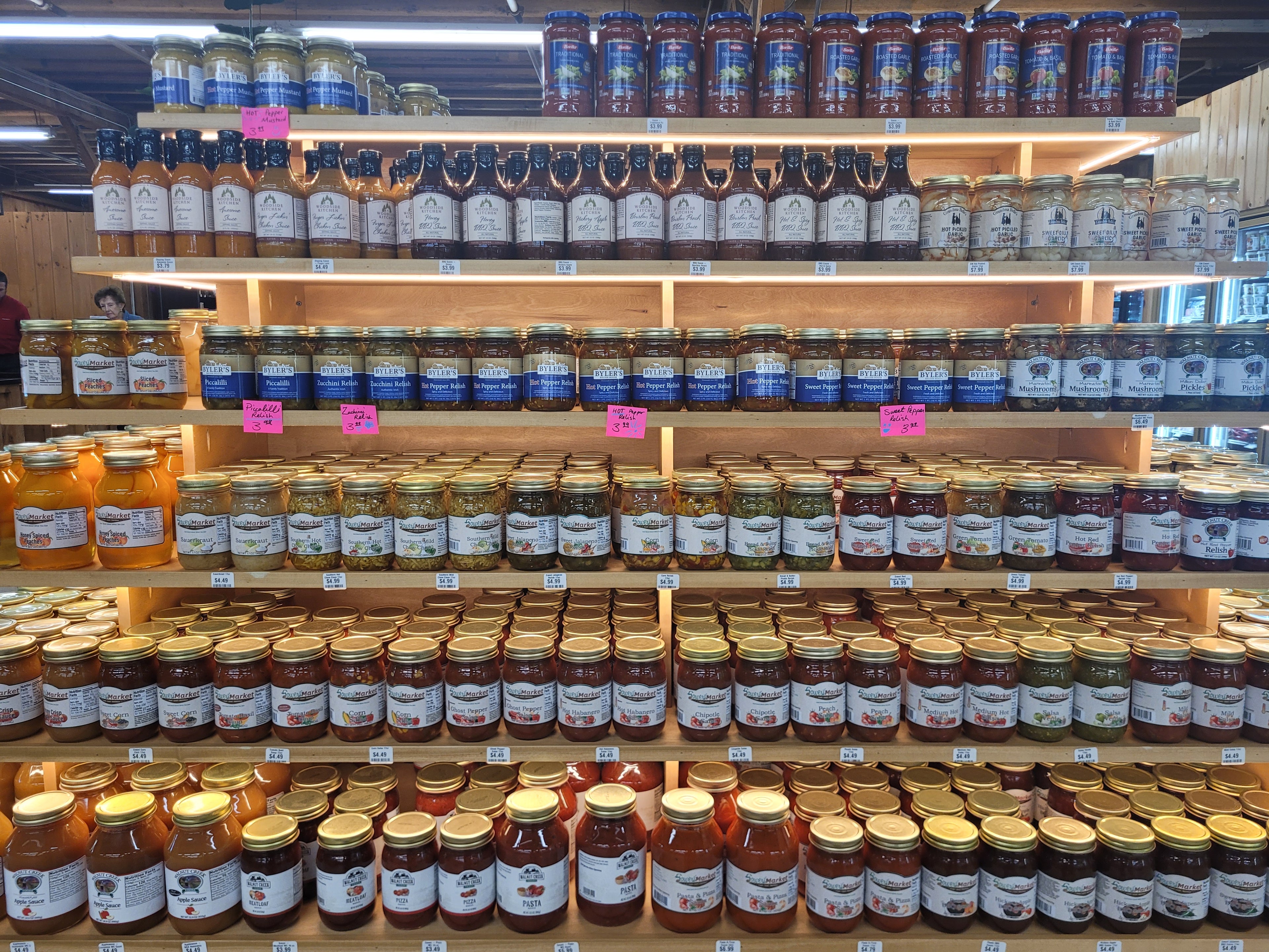Explore the vibrant selection at Sowers Jarred Goods, where every shelf is packed with delicious possibilities! From savory sauces and pickles to sweet jams and fruit preserves, our extensive range of high-quality jarred products, as seen in this bustling market display, offers something for every palate. Discover your next favorite kitchen essential or a delightful gift today!